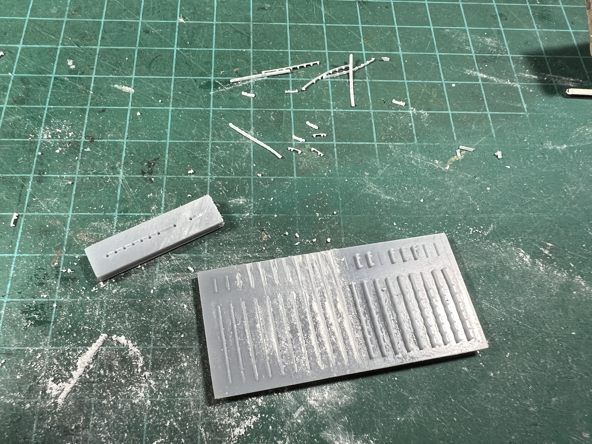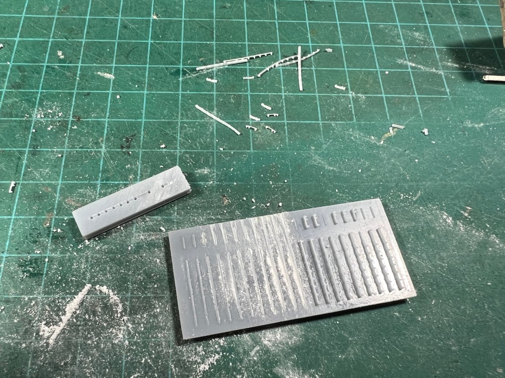 I wanted the strips as thin as possible as the rail head is less than .005″ (.13mm) proud of the rail web. So, I printed them .005″ thick on a special raft, supported for their lengths by a narrow plinth. Then, after many failed attempts, I found that by carefully filing away their backs with my safe-edge file, I could remove much of the thickness before the plinth let go. Usually this left a strip of plastic about .003″ thick holding the bolts together. I then loaded this strip into a special sanding block and rubbed it on a piece of sandpaper, getting it down to about .002″ thick. Printed in ABS-like resin, this strip was very delicate, but workable until it was glued to the rail web.