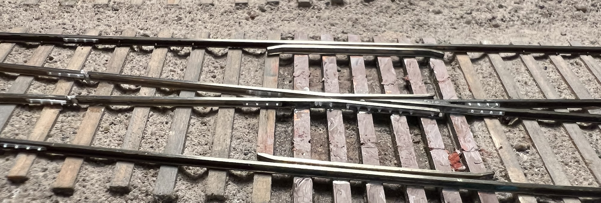 When I first laid the track for Pembroke, I left the detail off until it was running the way I wanted. That day is getting near. There are a few persistent derailments, but I’m getting better and better at fixing them. So, the southern-most two turnouts are starting to get dolled up.