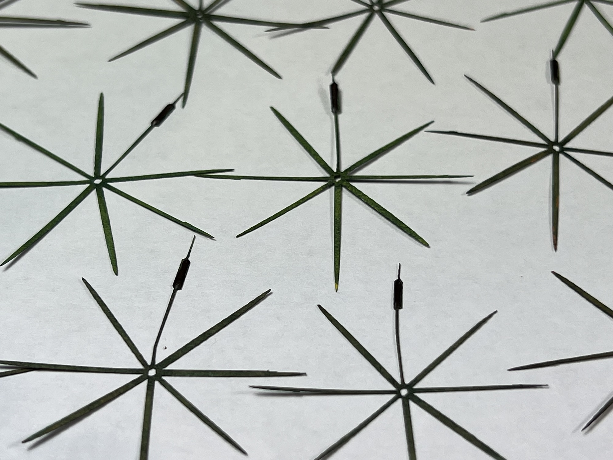 The last year’s batch were coloured with Prismacolor “Dark Green” art marker, and when they landed on the layout they turned out too blue. So I fed some yellow paint onto them to green them up. Sadly, I didn’t keep track of the yellow, and when it came to the next 200 plants, I used some “Yellow Orange” which made them too dark. “Canary Yellow” was just right, although it could probably benefit from a lighter starting colour.
