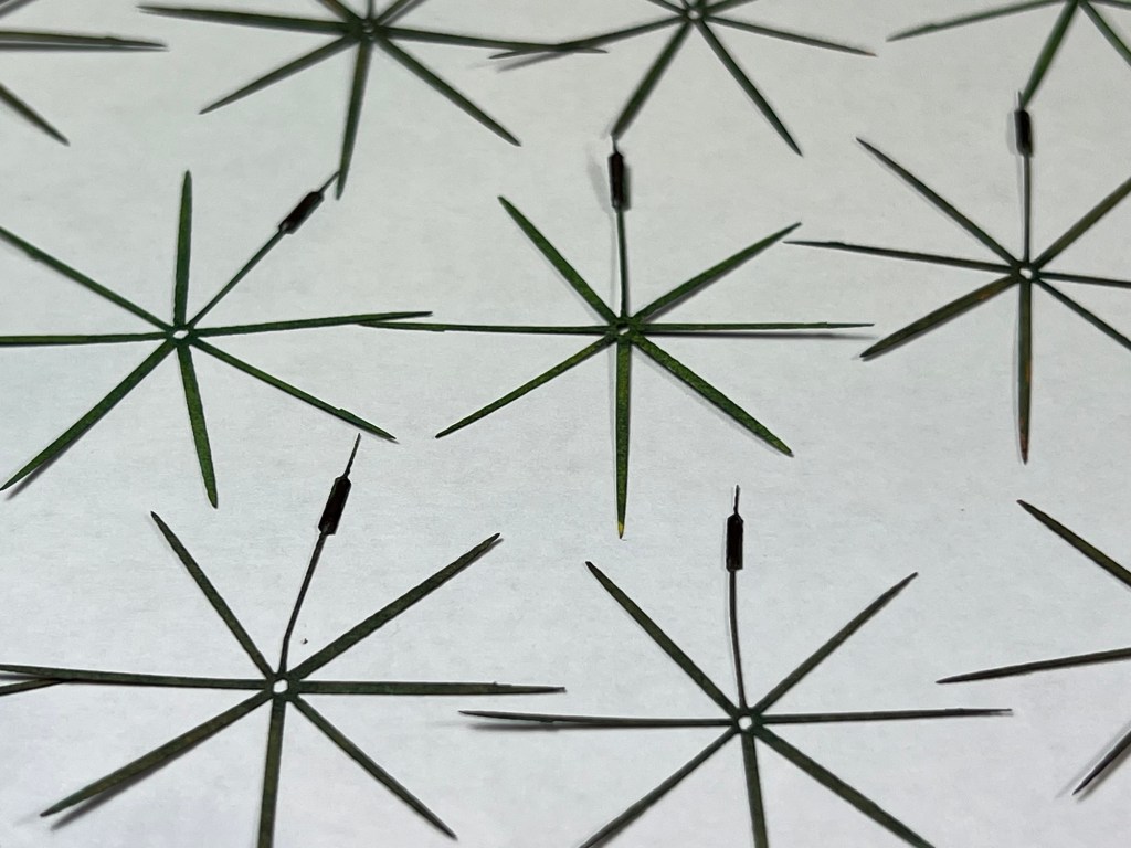 The seed heads are flat as they come off the laser, of course. To colour them and also thicken them up, I used acrylic paint. I first tried applying the paint with a brush, but the plants want to stick to the brush. I found a 1mL medical syringe enabled me to deposit a good thick bead of paint without touching the plant. Folk Art “Real Maroon Brown” is a nice colour, and the bottle squirts the paint directly into the syringe.