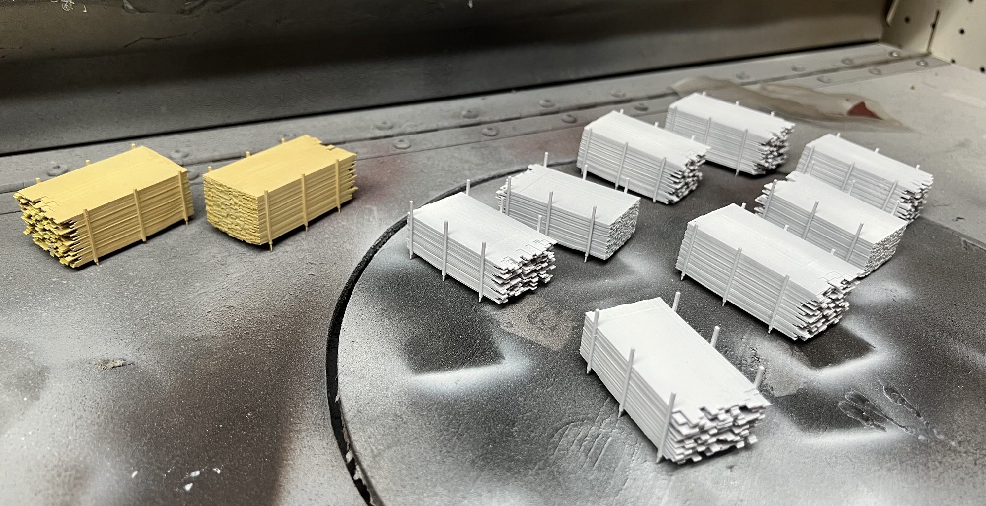 The 3D printer has been busy cranking out loads of lumber for the flat cars as I get ready for this year’s Railway Modellers’ Meet. I’d already printed quite a few loads, some of which are “factory seconds” and good only for experimenting, when I went back and looked at some photos of Canada Atlantic flat cars loaded with lumber.