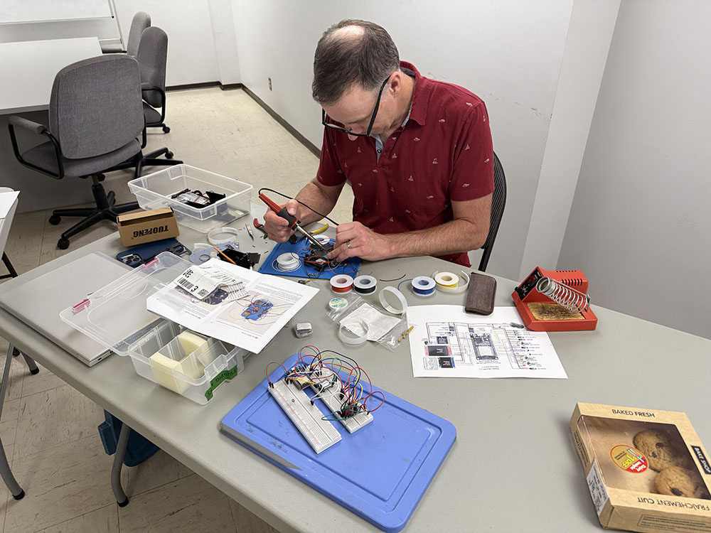 So the call for the monthly NMRA modelling night just after I returned from the family vacation in July was just what I needed! I have a steam throttle in progress that I took to a modelling night in the spring. I found all the bits and packed them into Blueberry the superannuated CR-V for the short trip to Tim Horton’s common room where he had tables and chairs set up for half a dozen modellers.