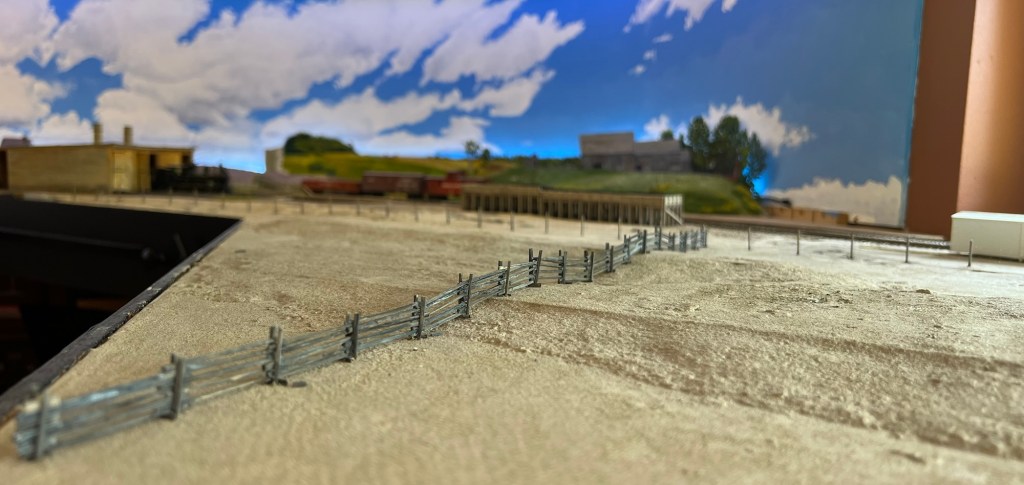 Despite countless household projects, the fence between the hay field and the wheat field managed to get completed this week. The hay will be on the near side of the fence in this view, putting the bright gold wheat field in the foreground from the usual viewing angle. I oriented the fence so it points to the water tower, which is removed for safety while I complete the scenery. Reflecting on the orientation, it might be a little too contrived. Well, we shall see.
