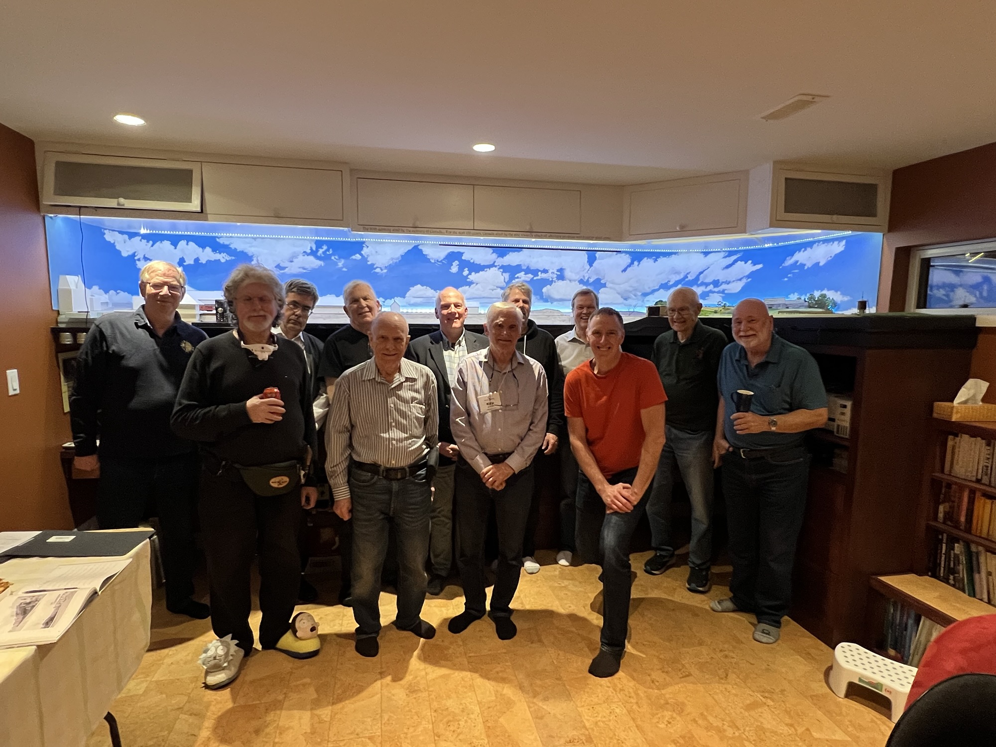 Eleven railroaders descended the stairs, and even though Pembroke itself doesn’t retain interest for very long, they all stayed for about two hours. The conversation at times was deafening. Deafening, that is, until Al blew 1120’s whistle, then suddenly everyone in the room shut up and watched the train. Thanks to all who attended, and I hope to see you again next year!