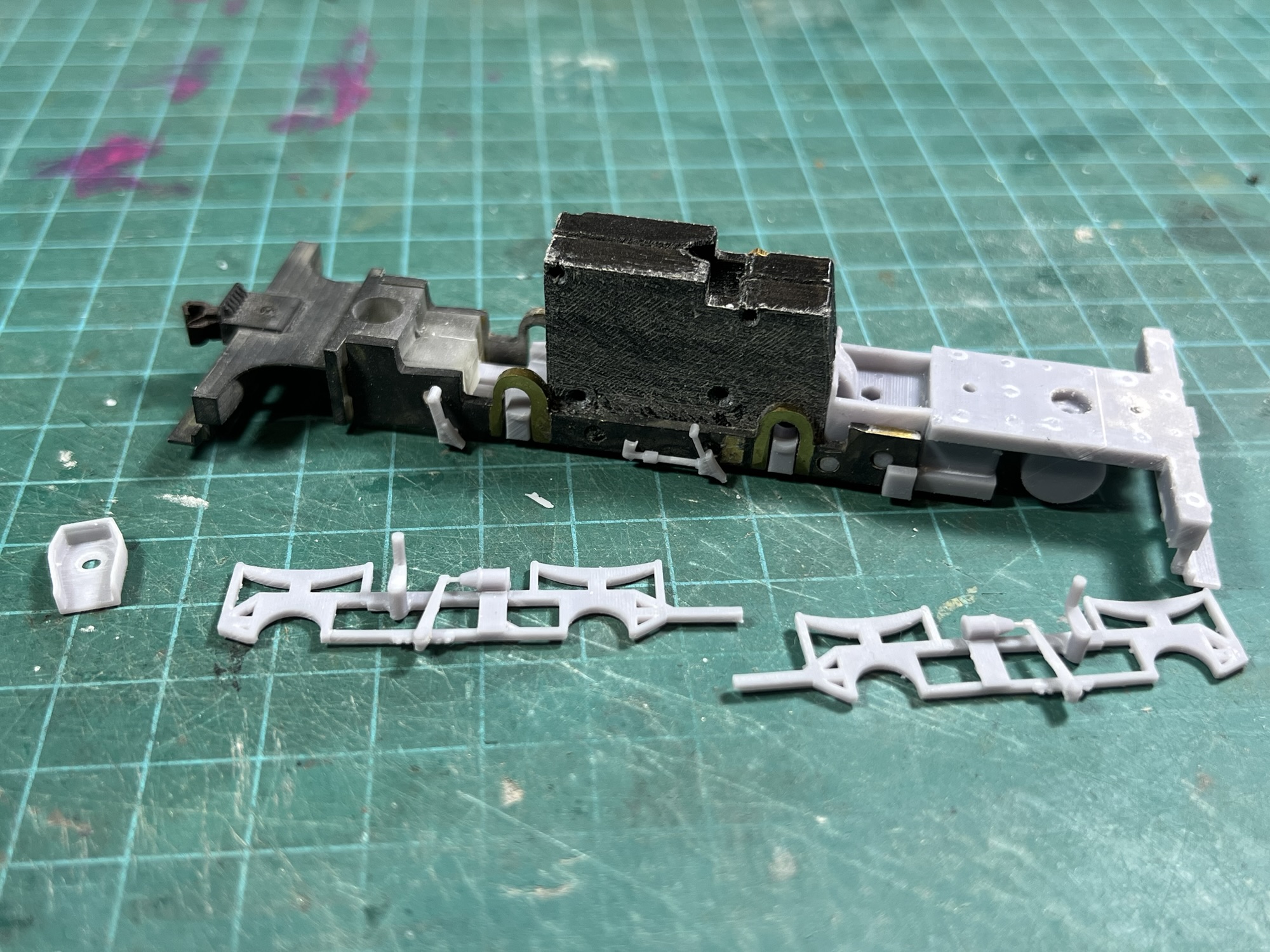 The parts rolled off the 3D printers over the course of the day today. The gearbox halves took all of 22 minutes on the FDM printer, while the resin printer poked along at all the bits that need to look good for over six hours. I’m happy and a little surprised to report that all the printing worked perfectly on the first try. There was a casualty in one brake when testing the fit on the frame, but the old version of the keeper plate was also missing a brake and nobody ever noticed. The cosmetic frames want a little filing and fitting before I can glue them to the brass frames, but otherwise I’m delighted with the outcome.