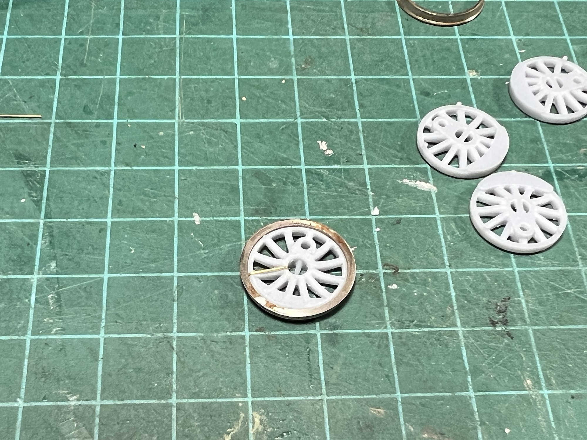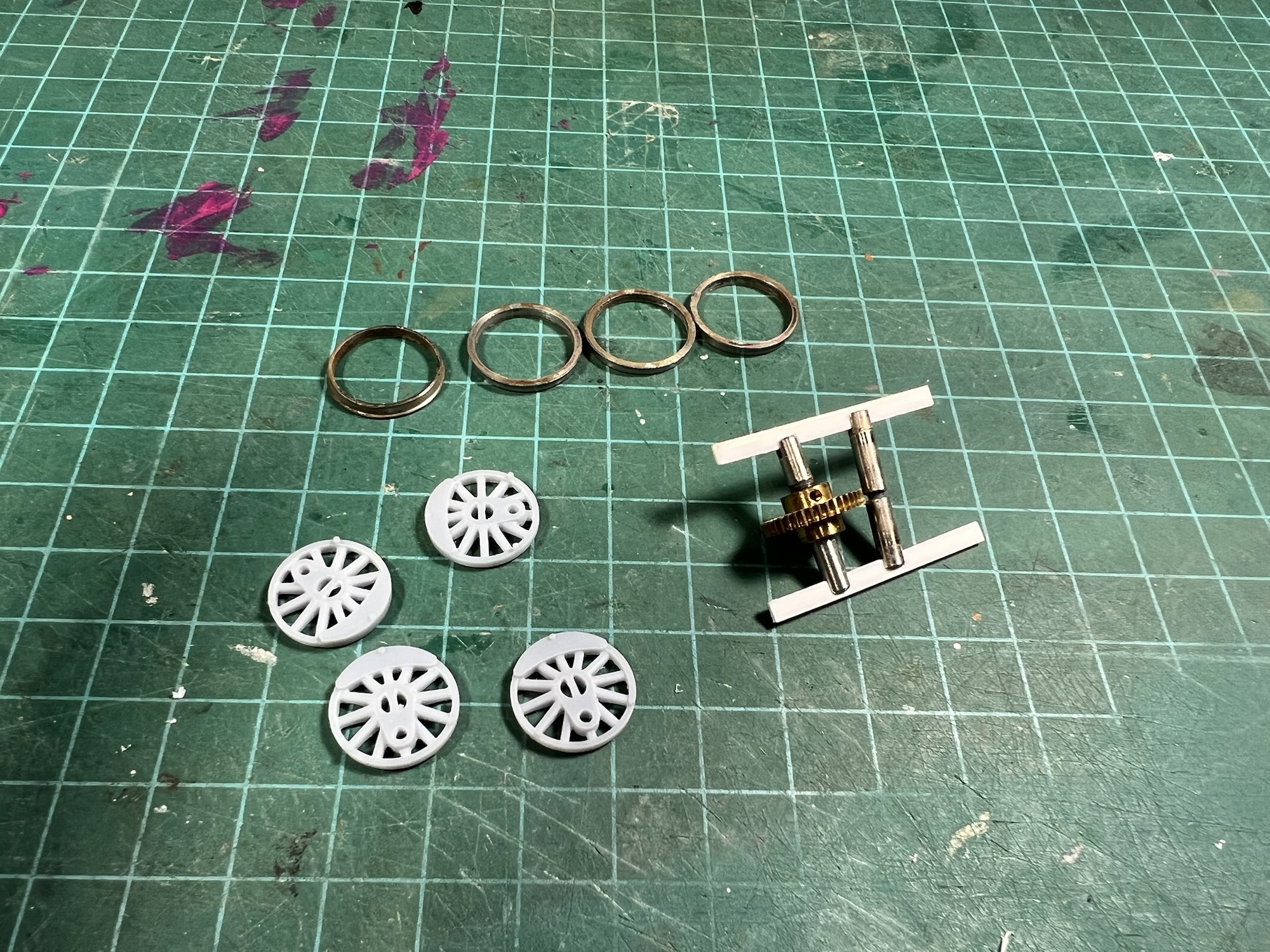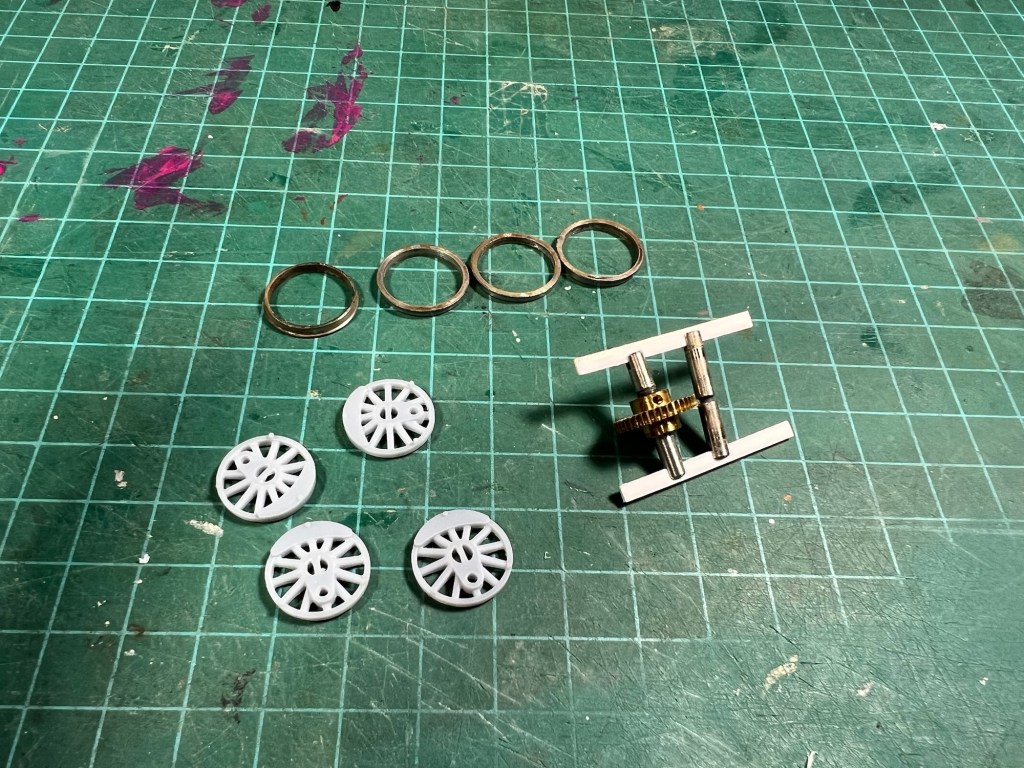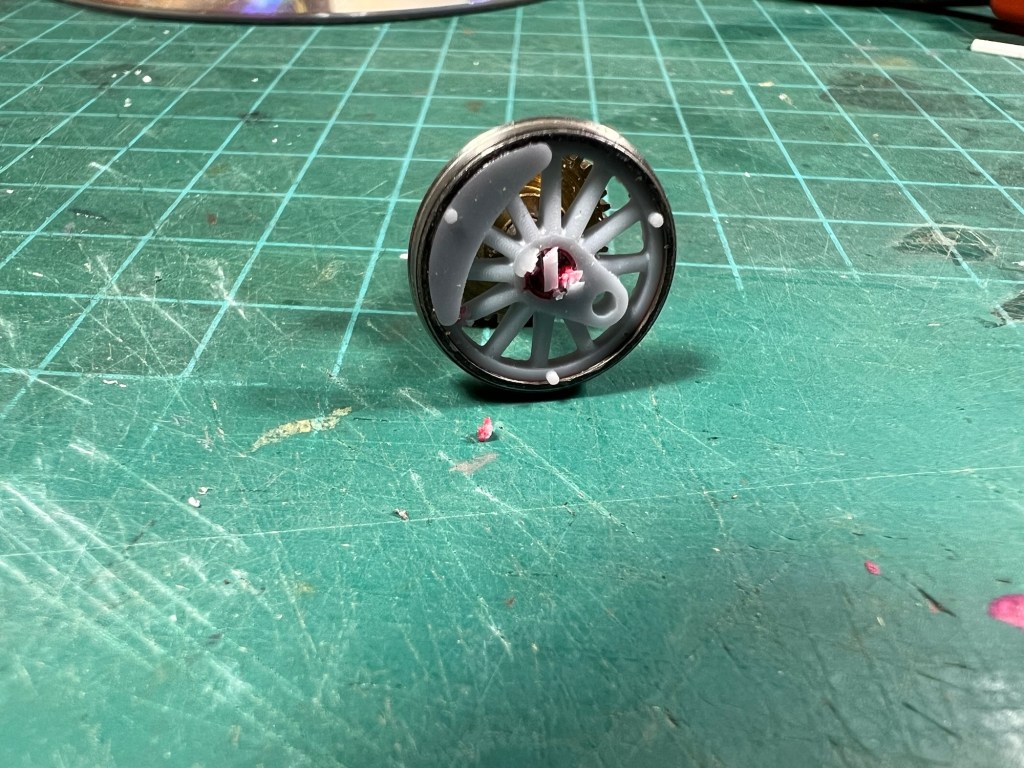 I printed new centres, and then found the orientation for the axles that makes the two slots line up. I want to avoid solder on the steel tyres this time, and so, I’m using a shorting wire that makes a mechanical connection by being trapped in a groove against the tyre and axle.