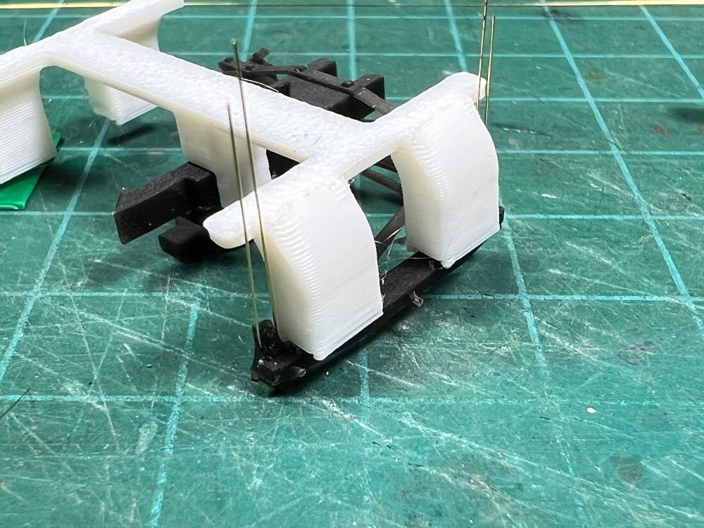 Finally, I filament-printed a jig to help align the brake hangers. On the prototype, these loops suspend the brake beams from the underframe, but on my models, they will be loose at the top to allow the trucks to swivel and be removed. I included them on my caboose trucks years ago, and I still have a tic from aligning them and cutting them to length. My initial test with the jig shows promise.