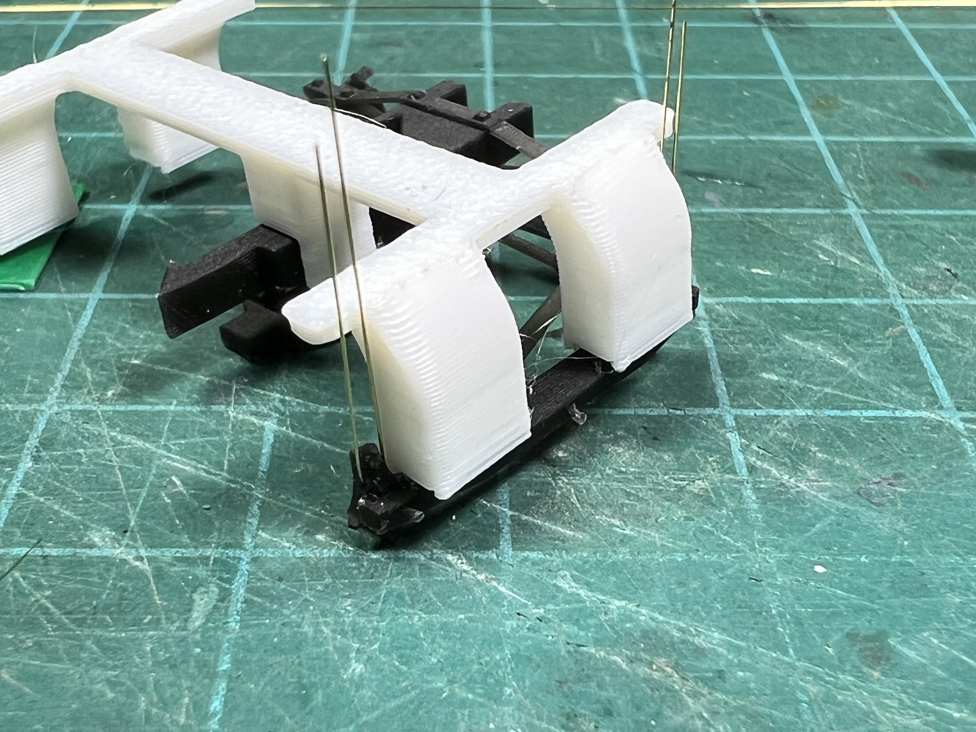 Finally, I filament-printed a jig to help align the brake hangers. On the prototype, these loops suspend the brake beams from the underframe, but on my models, they will be loose at the top to allow the trucks to swivel and be removed. I included them on my caboose trucks years ago, and I still have a tic from aligning them and cutting them to length. My initial test with the jig shows promise.